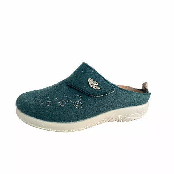 Obermaterial: Softfilz Innenmaterial: Softfilz Decksohle: Textil, Wechselfußbett Sonstiges: für lose Einlagen geeignet Passform: normal Absatz: Keil ca. 2,5 cm Sohle: PU-Laufsohle Verschluss: Schlupf Art. Nr.: 864101 Farbe: PETROLIO GRÜN